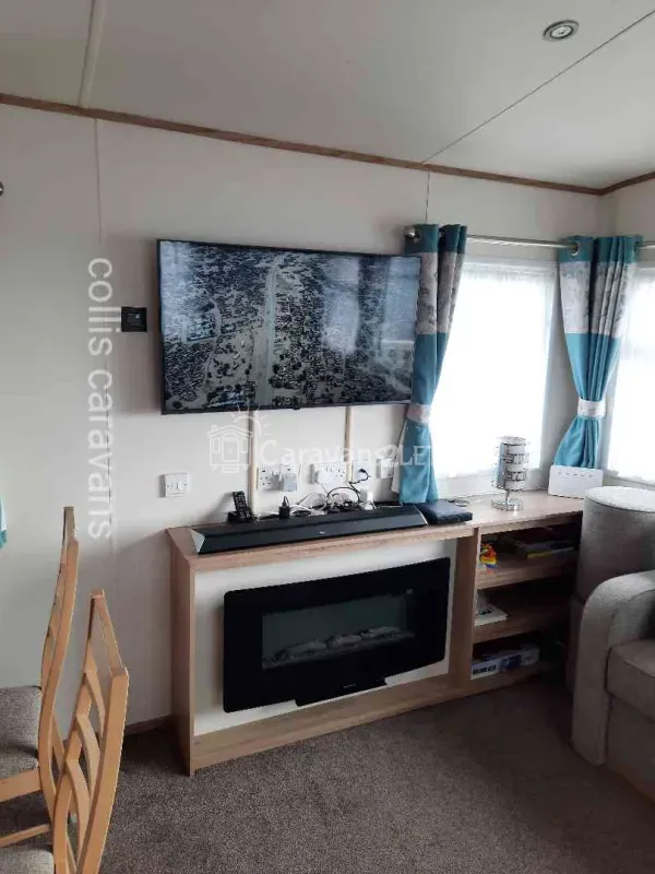 Within the living area we have a 43” 4k smart TV, Netflix, Amazon Prime, sound bar, DVD player with DVDs, 8 seater sofa, coffee table, electric fire, board games, radiator, fitted carpets, USB sockets, unlimited Wi-Fi and a dining table with 4 chairs.